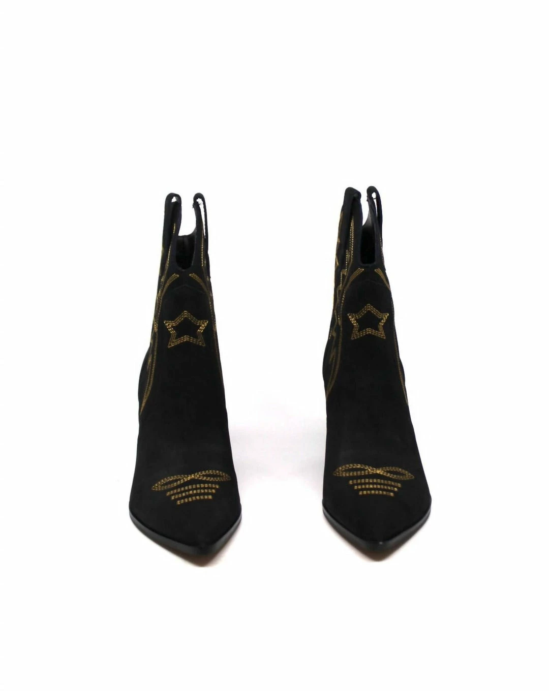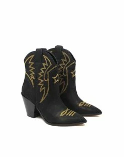 This gorgeous cowboy style boot has contrasted gold pipping on top of super soft black leather. This is the perfect bootie to add a little flair to any outfit.