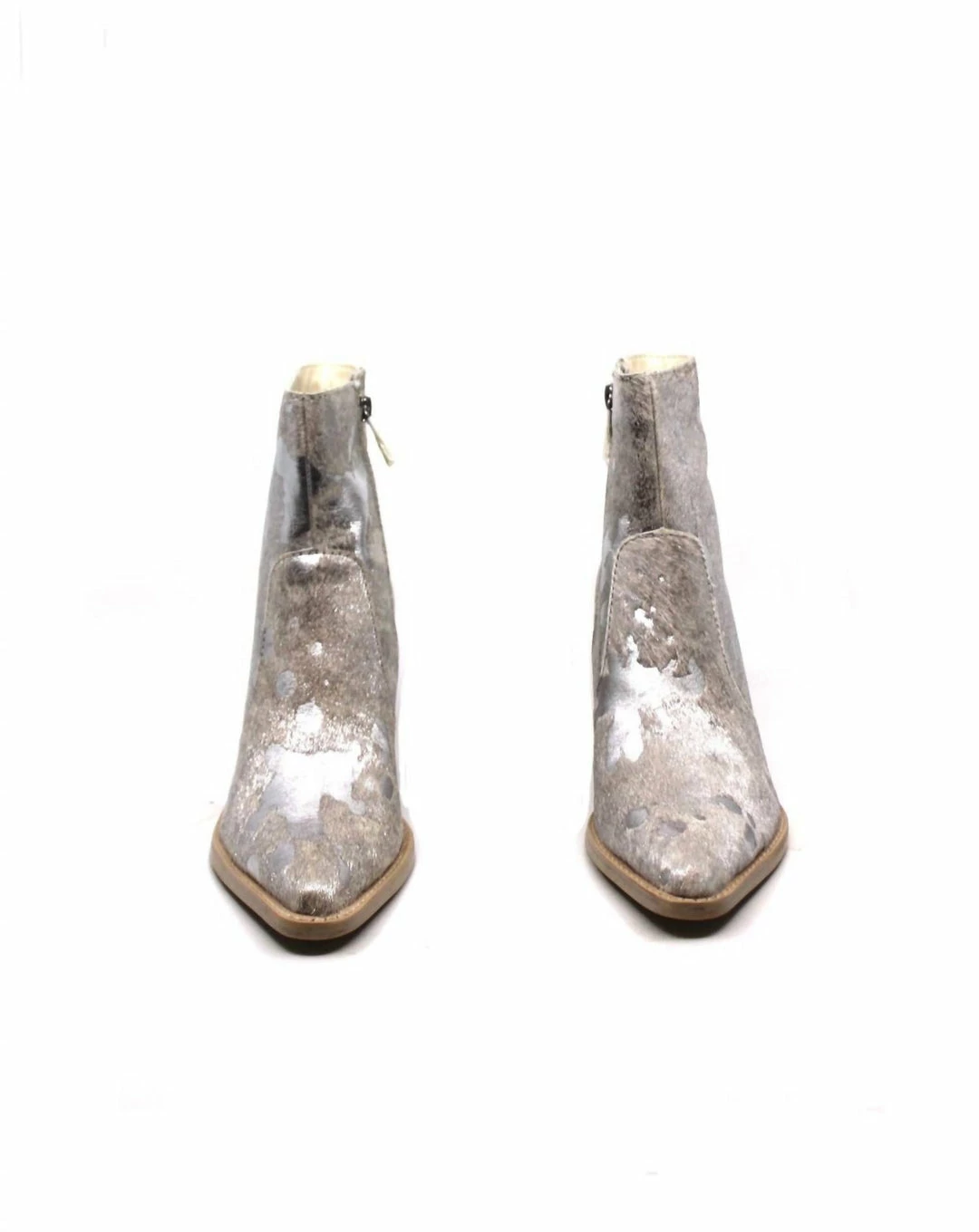 This western style ankle boot features a silver metallic splatter pattern on top of a soft calf-hair base. Pair with a mini dress for a fun night-on-the-town look, or with cropped jeans and a sweater for a daytime vibe.